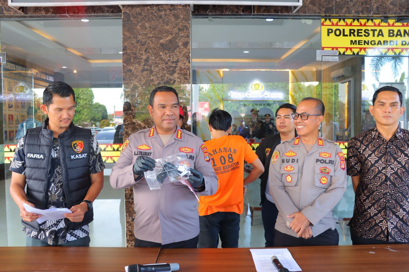 Kapolresta Bandar Lampung Kombes Pol Alfret Jacob Tilukay mengatakan, saat dilakukan pemeriksaan, petugas menemukan senjata api yang diselipkan di celana bagian belakang tersangka.