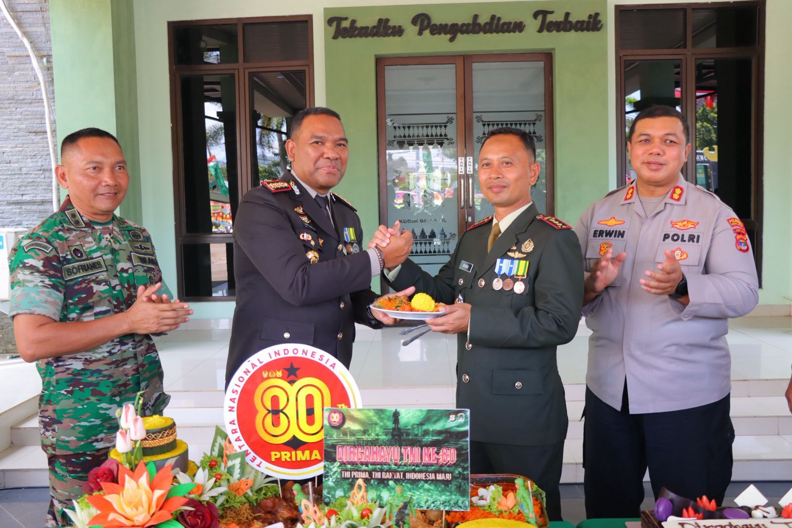 Kapolresta Bandar Lampung Kombes Pol Alfret Jacob Tilukay didampingi Waka Polresta Bandar Lampung, AKBP Erwin Irawan bersama sejumlah personel datang ke markas Kodim membawa kue ulang tahun dan nasi tumpeng sebagai bentuk apresiasi serta penghargaan atas dedikasi TNI dalam menjaga kedaulatan dan keamanan negara.