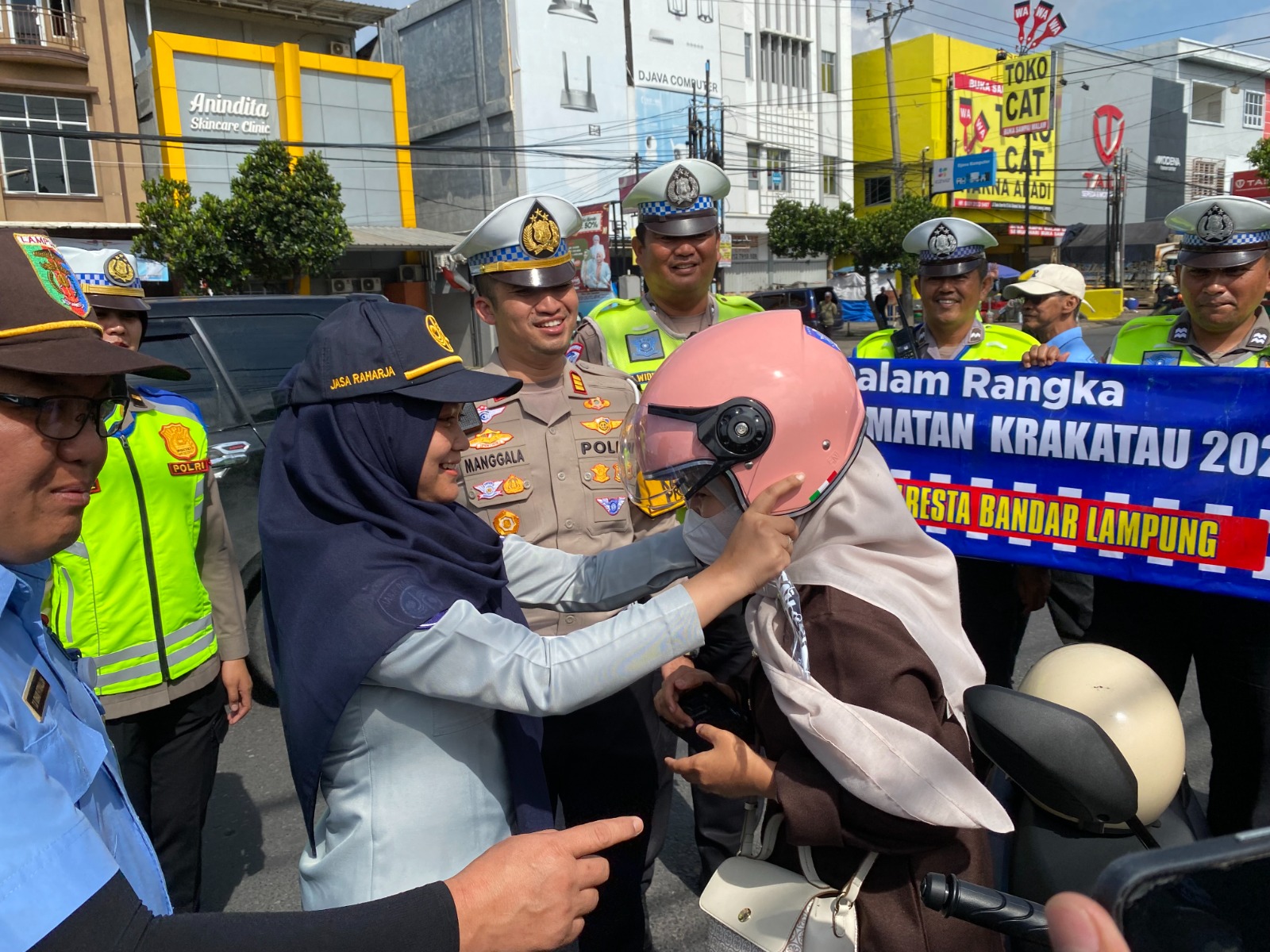 Bandar Lampung – Satlantas Polresta Bandar Lampung memberikan hadiah berupa helm dan cokelat kepada pengendara yang tertib berlalu lintas pada hari kedua pelaksanaan Operasi Keselamatan Krakatau 2026, Selasa (3/2/2026).
