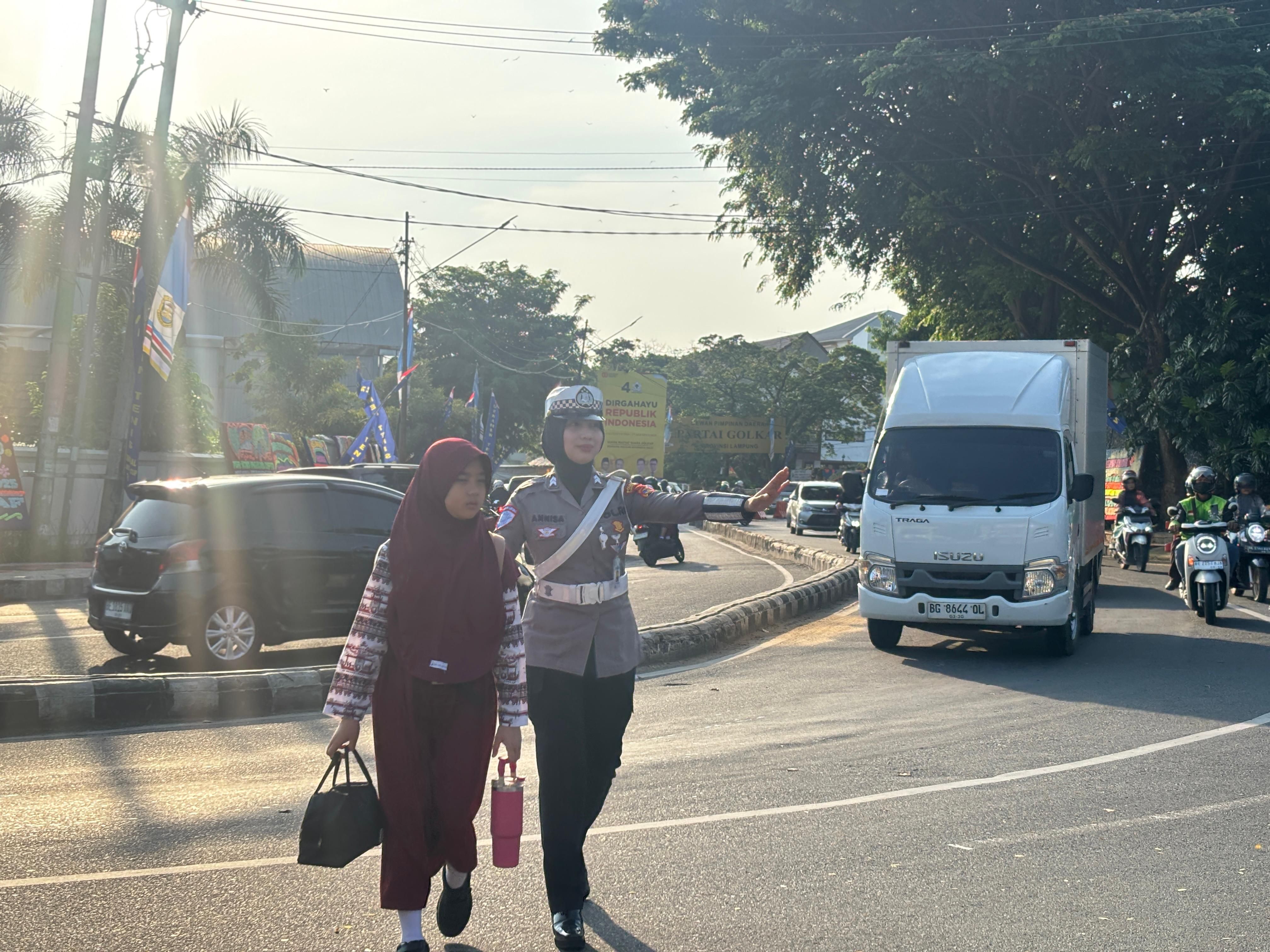 Selain mengatur arus kendaraan, personel juga membantu masyarakat, khususnya anak-anak sekolah dan pejalan kaki, saat menyeberang jalan. Hal ini menjadi bentuk kepedulian Polri terhadap keselamatan warga sejak dini.