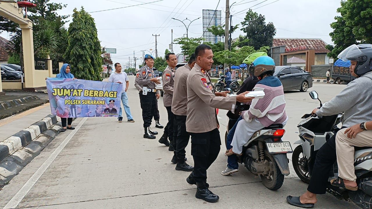 Bandar Lampung – Sebagai bentuk kepedulian sosial dan upaya mempererat hubungan dengan masyarakat, Polsek Sukarame menggelar kegiatan berbagi nasi kotak kepada masyarakat dan pengguna jalan yang melintas di depan Mapolsek Sukarame, Jumat (23/1/2026).