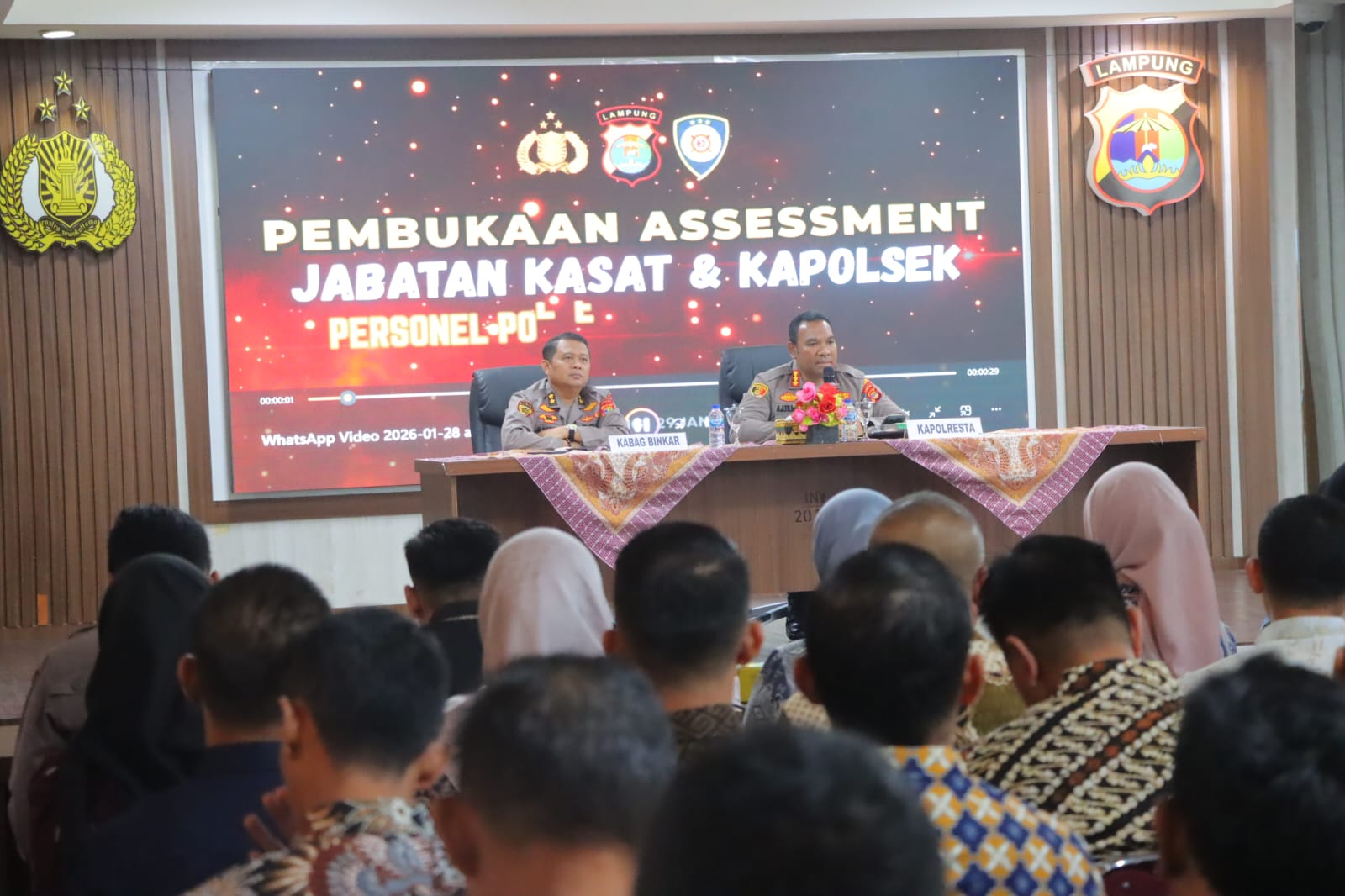 Bandar Lampung — Sebanyak 85 personel Polresta Bandar Lampung berpangkat AKP hingga Ipda mengikuti kegiatan assessment jabatan Kepala Satuan (Kasat) dan Kapolsek yang digelar di Aula Patria Tama Polresta Bandar Lampung, Kamis (29/1/2026).